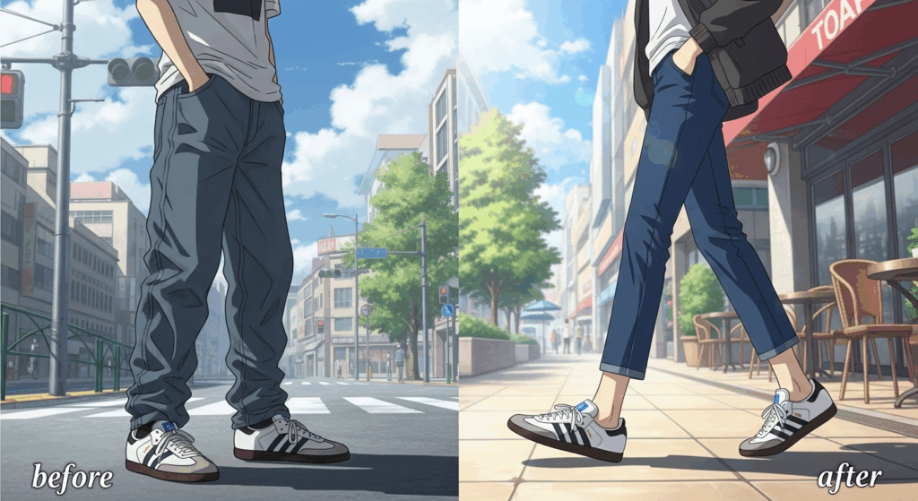 サンバを履くときに避けたい、時代遅れに見えやすいコーディネートの例をいくつかご紹介します。