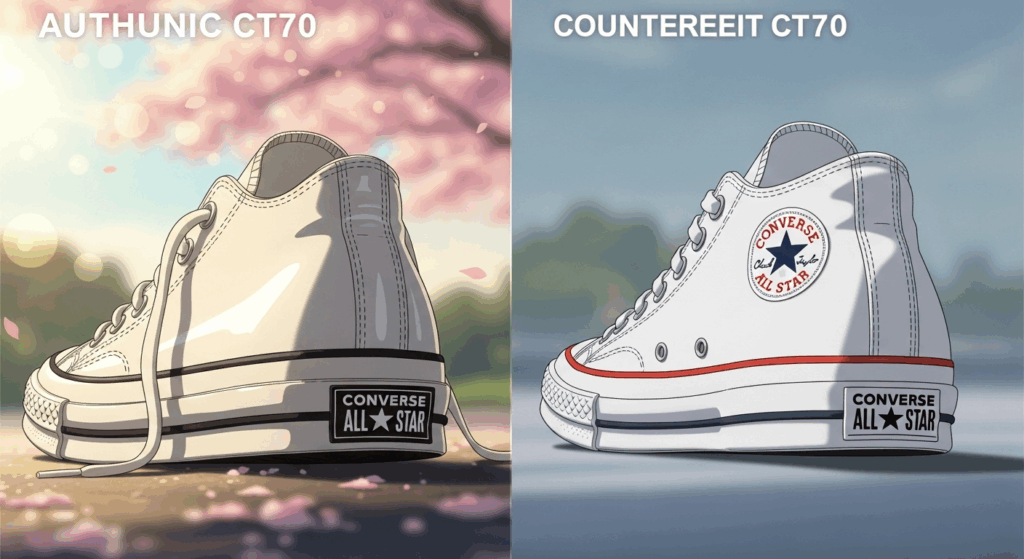 コンバースCT70の本物と偽物を見分けるには、いくつかの明確なチェックポイントがあります。