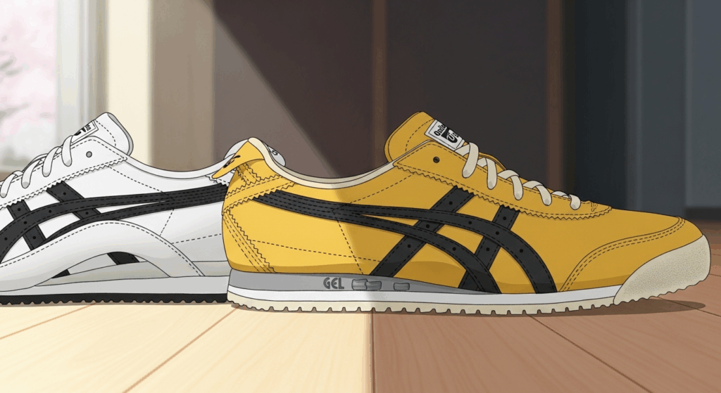 どちらもオニツカタイガーを象徴する薄底でスマートなシルエットと、サイドのオニツカタイガーストライプが特徴的です。
