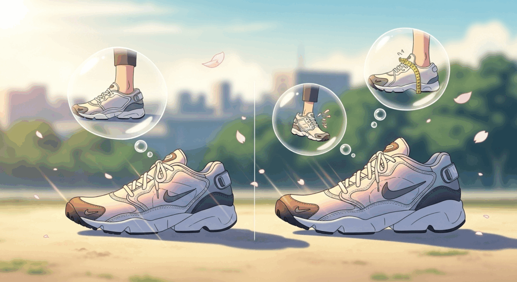 ナイキのエアリフトのサイズ感は、普段履いている靴よりも0.5cmから1cm大きいサイズを選ぶのがおすすめです。
